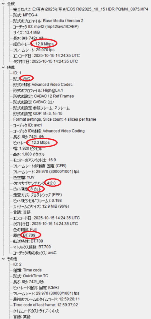 EOS R8で撮ったSDRのFHD動画とHDRのFHD動画のメディア情報を調べてみたので、載せておきます。 SDR HDR PQ 結論としては、FHDでもHDR+BT.2020で撮れるという事です。