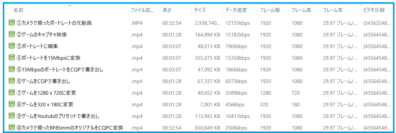 ⑤15MbpsのポートレートをCQPで書き出しと⑥ゲームをCQPで書き出しを比較して頂けます様に、同じCQPの設定でありながら圧縮し易いポートレートのビットレートが1.9Mbpsなのに対して、ゲーム動画が6Mbpsと明らかな差が生じています。