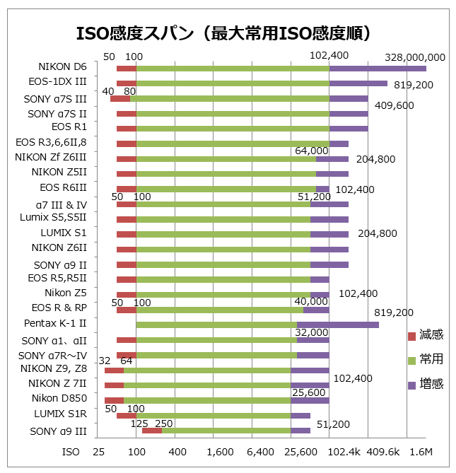 最大常用ISO感度順に並べたフルサイズ機と小サイズ機の最新ISO感度スパンチャートを以下に添付します。