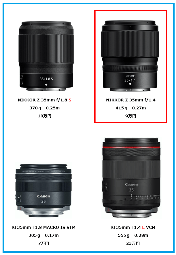 一方ニコンのNIKKOR Z 35mm f/1.4はと思って調べると、下にあります様にSレンズで9万円(中古で7万円前後)です。