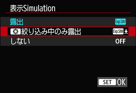すなわち、これですと通常の撮影においては常に露出シミュレーションは働かず、絞り込みボタンを押したときにしか露出シミュレーションは働かないのです。